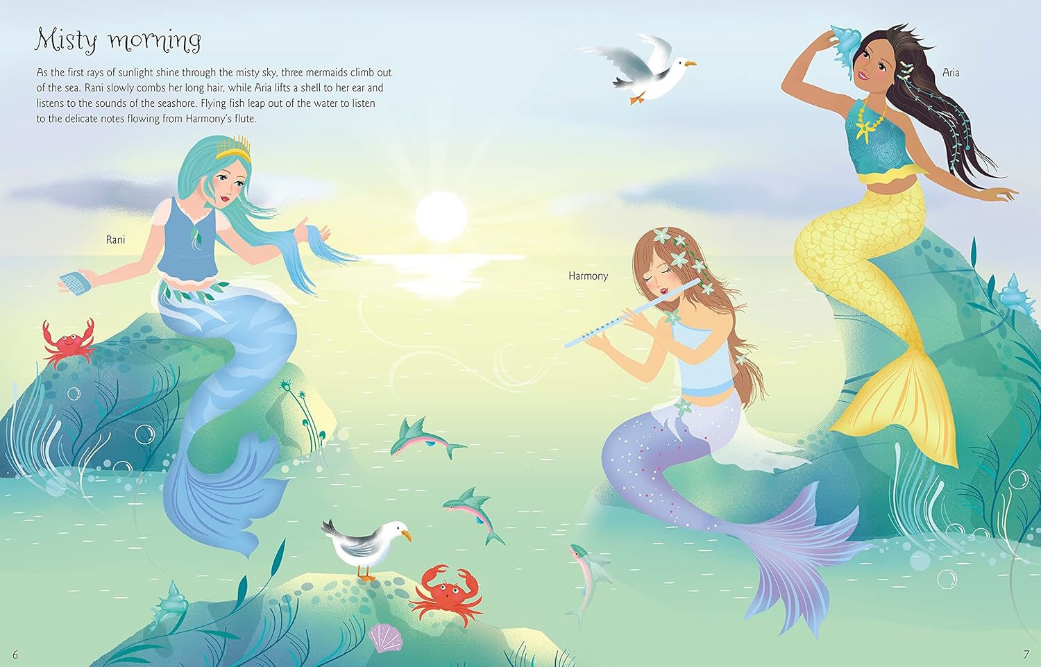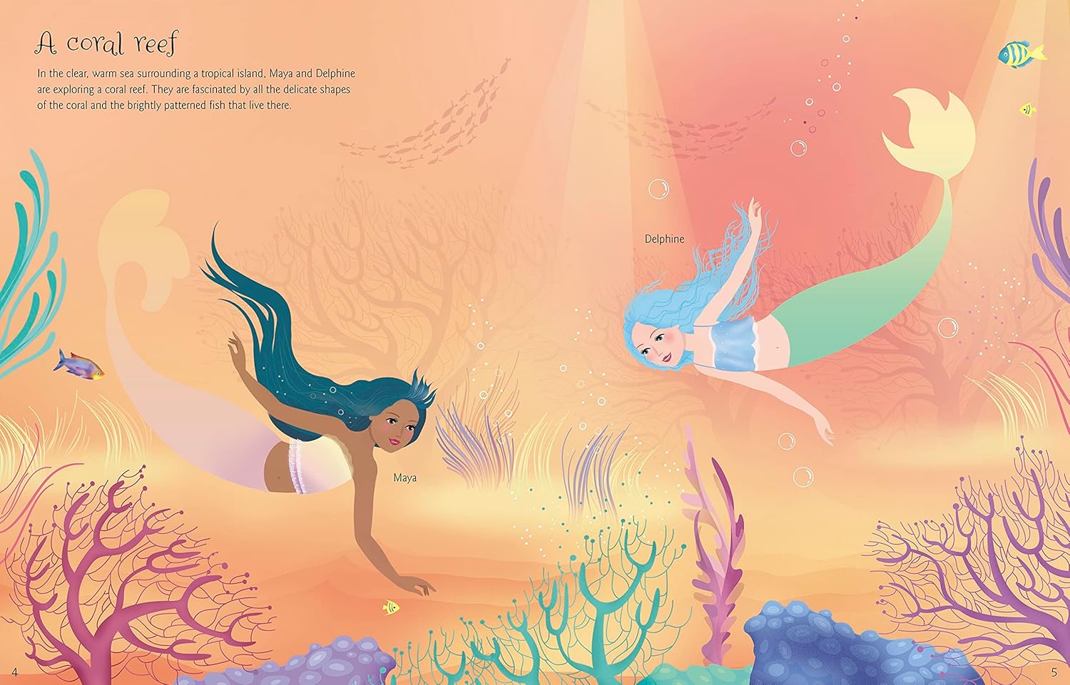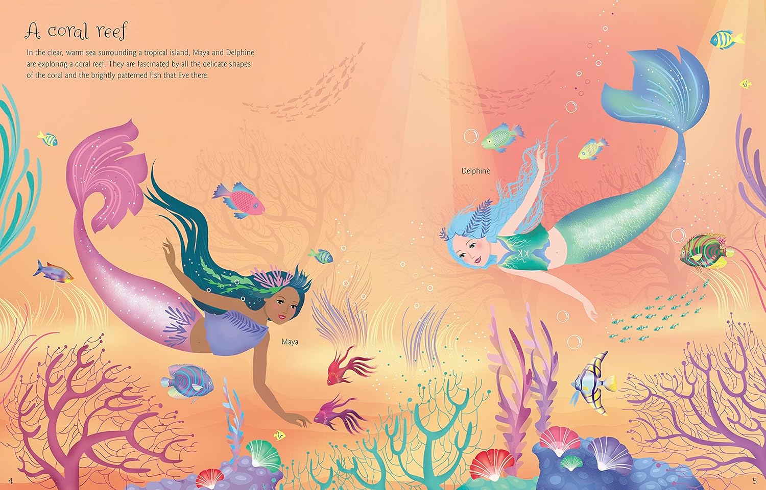 Enter the undersea world where mermaids gather pearls, meet a mermaid queen, find a treasure chest laden with gold and jewels and dive with sleek seals. This is a delightful addition to the bestselling Sticker Dolly dressing series. Dress the dolls, and add decorative tails and accessories from the sticker pages. The cover and one double page of stickers are foiled which adds extra sparkle to the colourful illustrations. Part of the highly successful Sticker Dolly Dressing series. The stylish illustrations and descriptive text, makes this perfect for any mermaid lover.