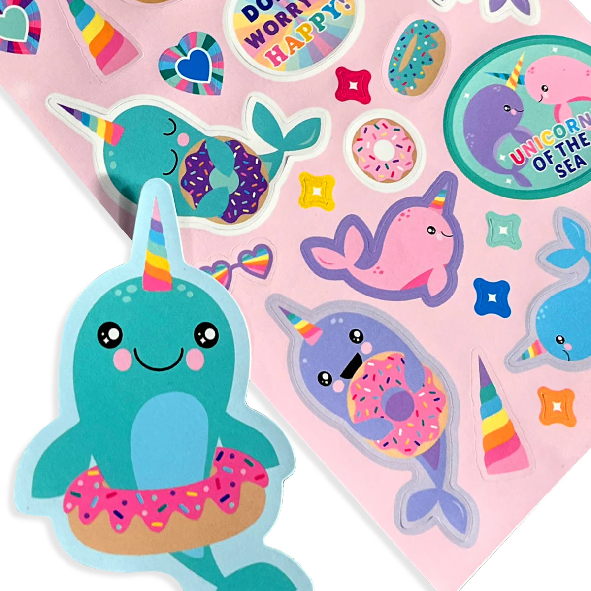 Your invitation to the narwhal party is here, and on the menu is nothing but deliciously delightful donuts. These scented stickers feature narwhals doing their favorite things - eating donuts and smiling! You can’t help but be charmed by these unicorns of the sea. In fact, we dare you to try not to smile when you come across this sticker on a notebook or lunchbox. Better yet, try not to take a deep whiff of their delicious donut scent! Two paper sticker sheets plus six die cut stickers are included. They’re a real treat as birthday party favors too!