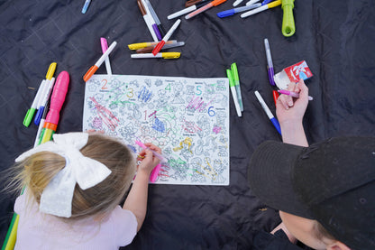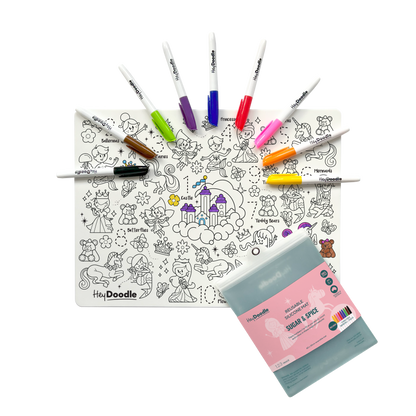 Practice writing the number figures whilst counting to find all items corresponding to them. Make the fairies and unicorns come to life with bursts of color! And then do it all again by simply washing off the color. *pack includes 1 heydoodle mat (40x30cm), 9 heydoodle markers, and a travel pouch.