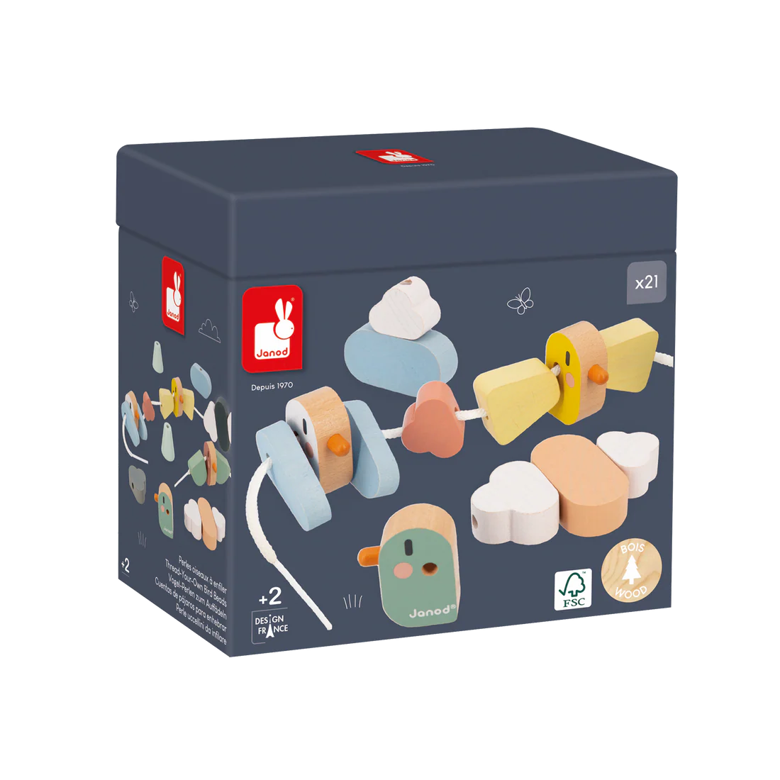 Your child will be able to create a pretty garland, understand their very first logical sequences, and develop their imagination by creating unique birds: what a fun educational toy! And if little ones decide not to use the cords, the wooden beads stand upright and become adorable figurines that can be manipulated, time and time again. With their first beads, toddlers will develop their imagination, logical thinking, shape recognition and, above all, their fine motor skills!