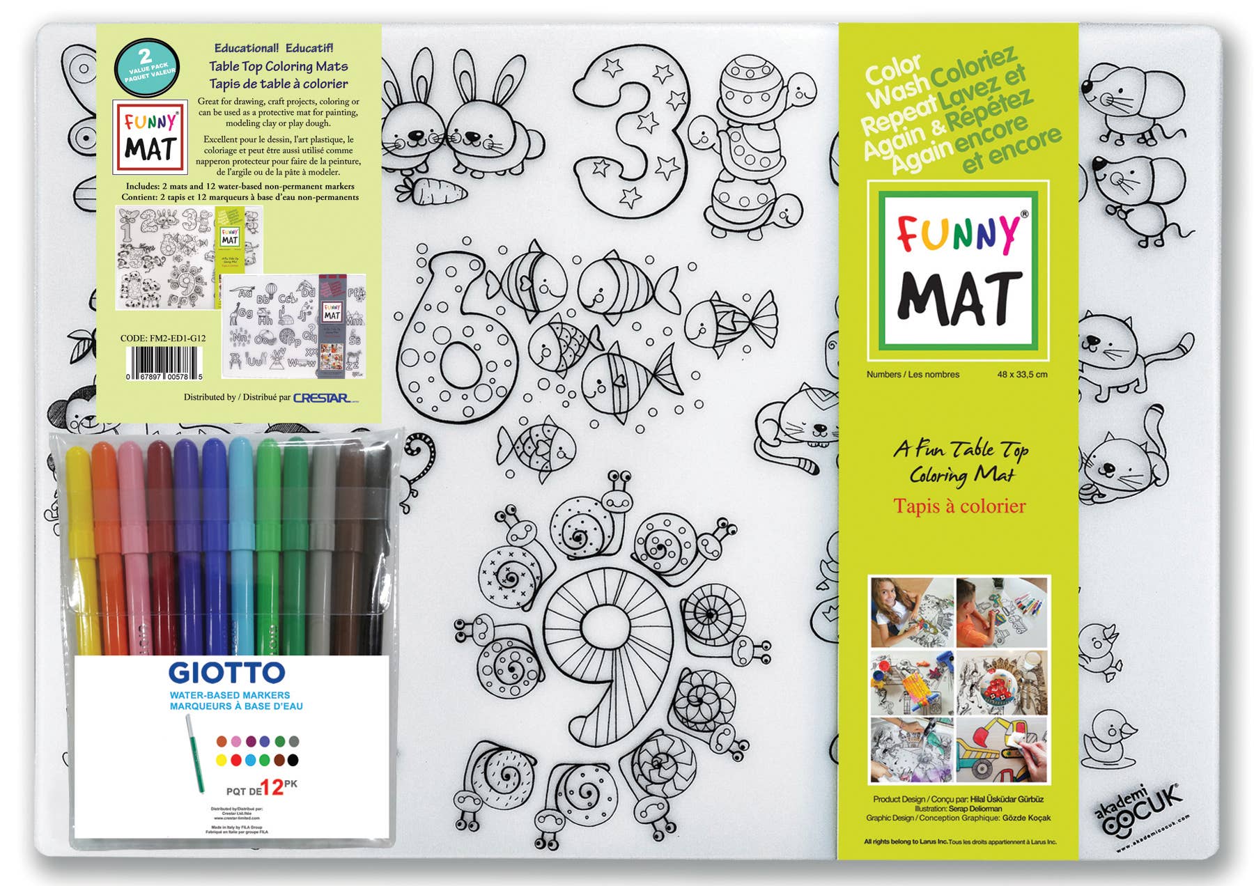 Funny Mat is a table top cover that can be used for craft projects such as drawing, coloring or as a protective mat for painting, plasticine and play dough or as a placemat. The designs on Funny Mat can be colored with water-based, washable markers. Funny Mat is made of polyproylene and is recyclable and reusable. Each mat size is 33.5 x 48 cm (13.2" x 18.9"). Set includes mats with educational Numbers and Alphabet designs with 12 Giotto markers in assorted colors.