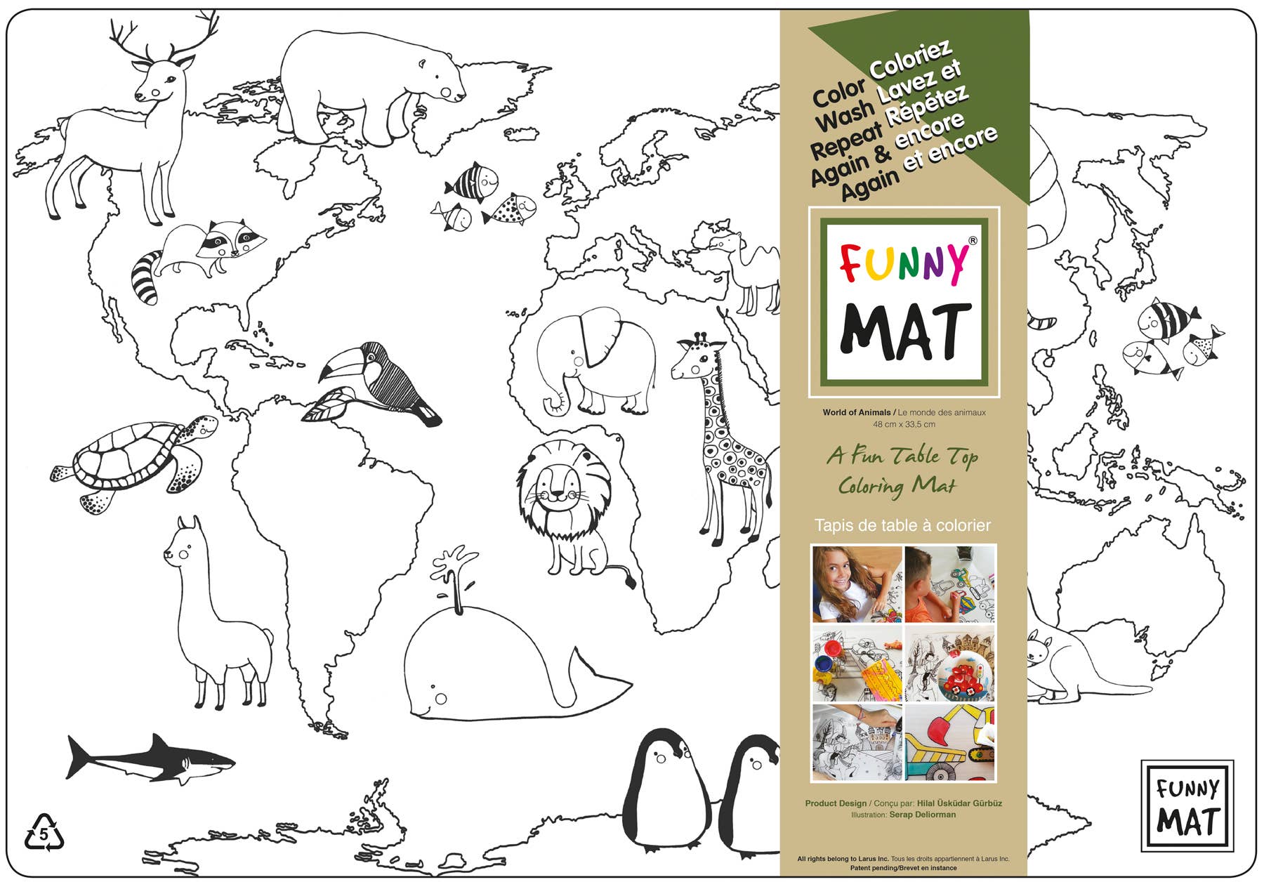 Funny Mat is a table top cover that can be used for craft projects such as drawing, coloring or as a protective mat for painting, plasticine and play dough or as a placemat. The designs on Funny Mat can be colored with water-based, washable markers. Funny Mat is made of polyproylene and is recyclable and reusable.