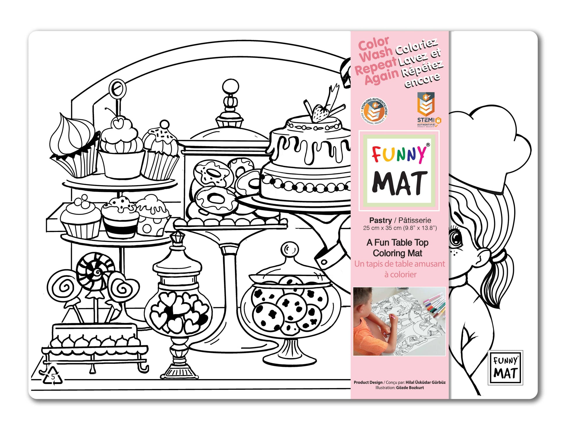 Funny Mat is a table top cover that can be used for craft projects such as drawing, coloring or as a protective mat for painting, plasticine and play dough or as a placemat. The designs on Funny Mat can be colored with water-based, washable markers. Funny Mat is made of polyproylene and is recyclable and reusable. Each mat size is 25 x 35 cm (9.8" x 13.8").