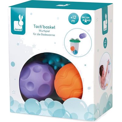 Basketball hoop for the bath to hang on earthenware thanks to its suction cups. Accompanied by 3 sensory balls to develop motor skills and concentration of the child. Closed box with window
