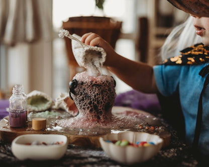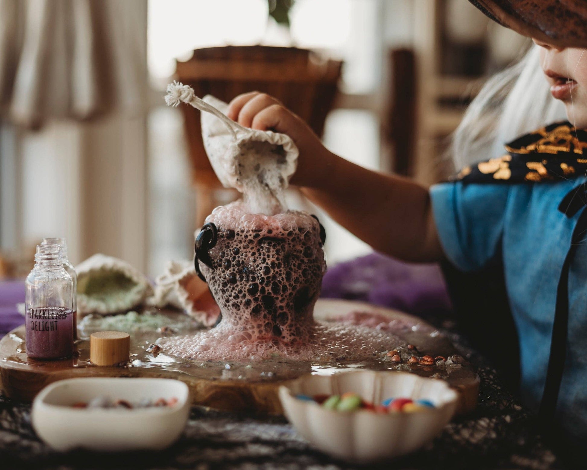 This potion play set is packed with spooky and sweet ingredients that are only available at Halloween times. Ingredients like Grave Gravel and Bone Dust and sweet Candy Crush and Raspberry Fizzle. Will you keep your spooky and sweet ingredients separate or make a big trick or treat witches brew? It's up to you and where your imagination can take you.