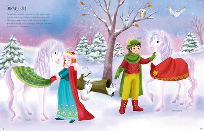 Enter the magical kingdom where princesses look after unicorns, ride them as they fly into the sky, take them on a snowy walk and exercise them on a beach. Use the stickers to dress the dolls and decorate the fantastic scenes.
