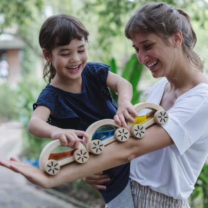 The PlanToys Wautomobile is a semi-circular-shaped car that comes with colored water on the inside with the option of red, blue, or yellow. Children will enjoy rolling the wautomobile around and learning about new colors and color theory by putting the cars adjacent to one another to allow light to pass through to create new colors. Which color will you choose for your wautomobile?